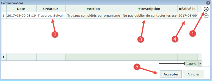 - La communication est sauvegardée automatiquement après avoir cliqué sur le bouton "Accepter".